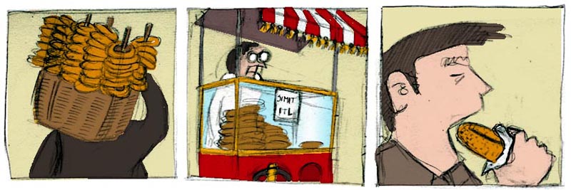 We ontmoeten Kenan en Onur bij de metro-uitgang op het Taksim-plein, en lopen naar een zeer groot grand café (vier verdiepingen) aan de Istikal Caddesi, de grote winkelboulevard, waar we rustig kunnen praten. Koffie, (ijs)thee, grote ‘sandwiches’. Kenan neemt een groot stuk chocoladetaart, dat hij maar half opeet. De hele middag zitten we te praten, ook over strips en cartoons in Nederland. Een dubbelzijdig interview, noemt Onur het, al is dat een beetje overdreven. Onur vertaalt, soms probeert Kenan iets in het engels te zeggen, maar z’n engels is gebrekkig (en ons turks houdt ook al niet over). Aan het eind van de middag gaan we voor bier naar een café, pal tegenover de redactieburelen van Uykusuz.
